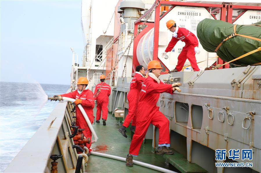 11月9日,“雪龙”号船员在甲板上进行消防演习。当日,在“雪龙”号起航不到24小时,第34次南极科考队举行首次“弃船演习”,100余名队员参加。随后,“雪龙”号船员还进行了消防演习。整个演习过程持续半小时。新华社记者白国龙摄